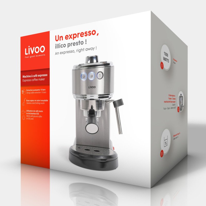 Machine à café LIVOO DOD186 – Pression 15 bars – 3 interrupteurs: 1 tasse – 2 tasses – marche/arrêt buse vapeur – Réservoir amovible 1 L – Puissance: 1350 W – Percolateur pour café moulu et pour dosettes ESE en papier – Buse vapeur en acier inoxydable – 3 filtres en acier inoxydable: 1 tasse, 2 tasses et pour dosettes ESE – Cuillère doseuse avec tasseur inclus – Plateau égouttoir – Plateau perforé amovible – Couleur: gris – Garantie: 1 an.