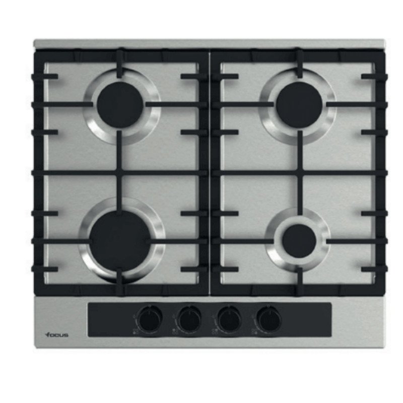 Plaque de cuisson FOCUS – Largeur: 60 cm – Nombre de feux: 4 brûleurs à gaz Flamme stabilisée – Grilles: fonte – Allumage automatique – Commandes frontales – Couleur: InoxGarantie: 2 ans.