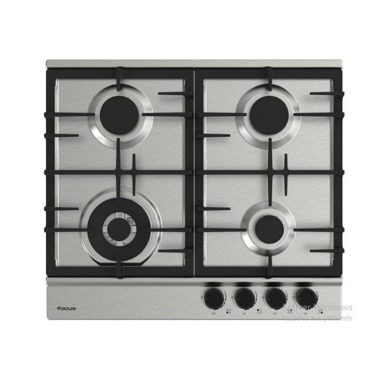 Plaque de cuisson FOCUS – Couleur: Inox – Largeur: 60 cm – Nombre de feux: 4 brûleurs gaz – Flamme stabilisée – Grilles: fonte – Allumage auto – Sécurité thermocouple – Garantie: 2 ans.