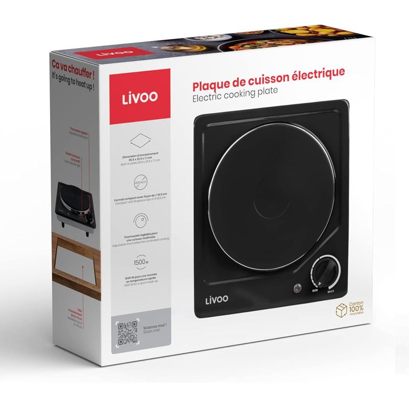 Plaque Encastrable LIVOO – Type: Électrique – Nombre de feux: 1 Feu (∅18,5 cm) – Puissance: 1500 Watts – Commandes frontales – Avec touche moderne et élégante – Témoins lumineux de chauffe – Pieds antidérapants – Dimensions d’encastrement: 22 x 25 cm – Couleur: Noir – Garantie: 1 an.