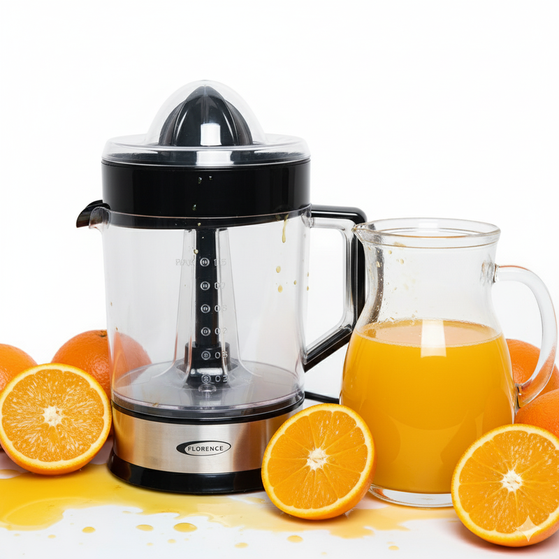 Presse-Agrumes Florence HK-408 – Puissance: 50W – Volume: 1,2 L – Compact et moderne – il prépare 4 à 5 verres de jus frais rapidement – Anti-goutte – facile à nettoyer et parfait pour un usage quotidien – Garantie: 1 an.